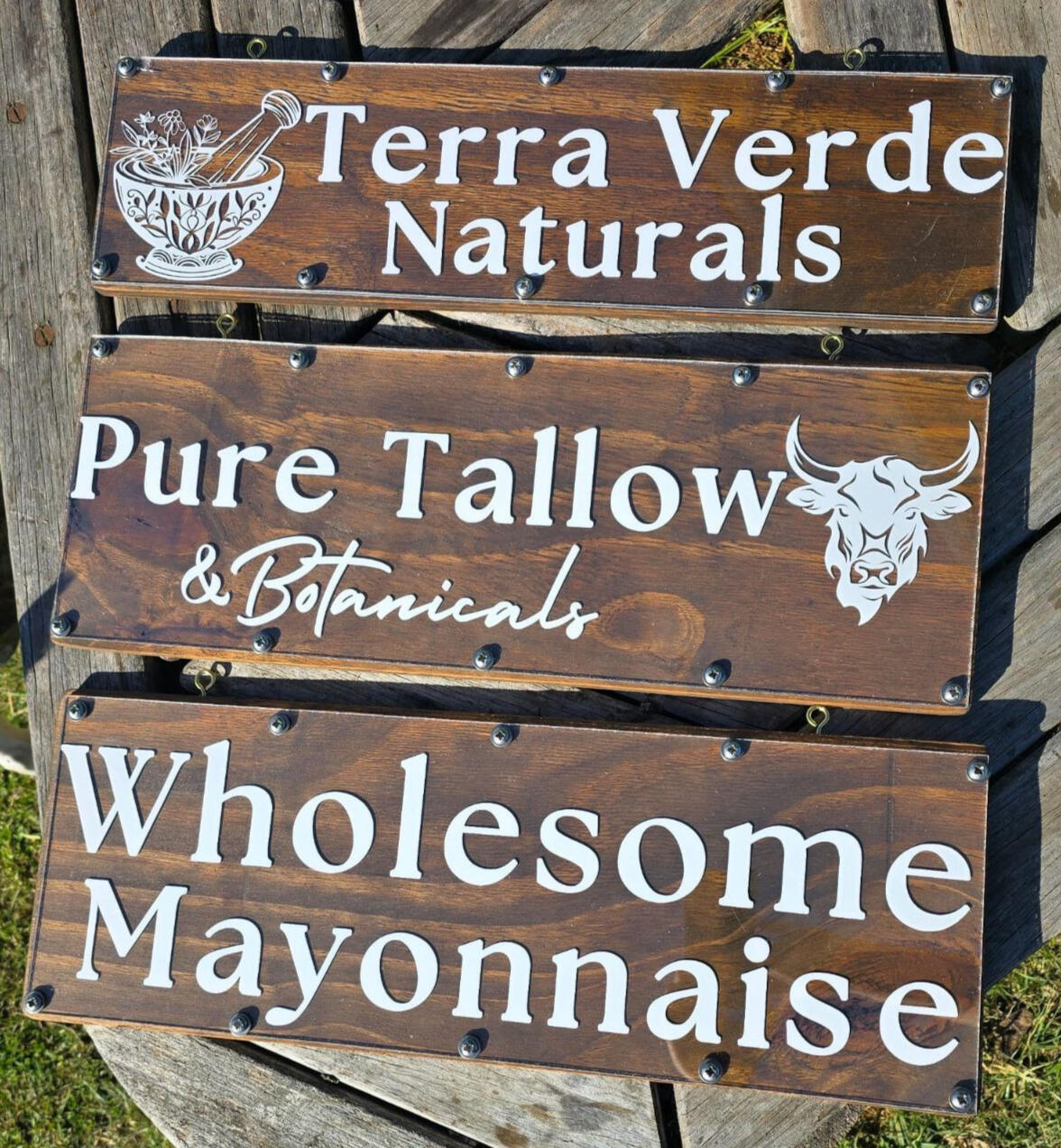 Display signs for Terra Verde Naturals at the Wild Oats Community's Farmers Market: